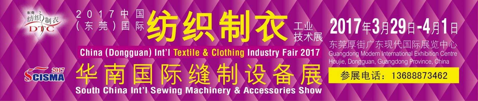| 展會(huì)名稱 | 第十八屆中國(guó) (東莞) 國(guó)際紡織制衣工業(yè)技術(shù)展(DTC2017)暨第十二屆華南國(guó)際縫制設(shè)備展(SCISMA2017) |
