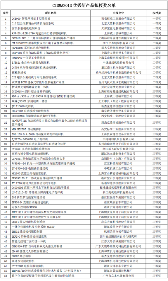 根據(jù)中國縫制機械協(xié)會《關(guān)于開展“CISMA2013優(yōu)秀新產(chǎn)品評選”的通知》(中縫協(xié)[2013] 06 號)要求,CISMA2013優(yōu)秀新產(chǎn)品項目申報及評選階段工作已基本完成,經(jīng)協(xié)會科技委組織專家對申報項目認真評審,現(xiàn)將評選初步結(jié)果公布如下(詳見附件),請大家認真核查,積極監(jiān)督,如有疑義,請于2013年9月6日之前反饋。