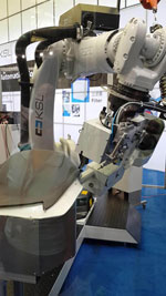 2013中國國際縫制設(shè)備展覽會一號館,迎面可見一個偌大的四方形玻璃框內(nèi),一副大型機器手對著一張凹凸有致的深灰色轎車前臺板,按照電腦控制程序正悄無聲息地進(jìn)行著三維度縫接演示,周遭圍滿了興致勃勃的參觀者。
