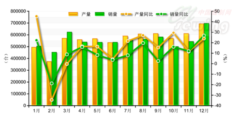 年初,行業(yè)傳統(tǒng)旺季,由于企業(yè)普遍庫存量較大,生產(chǎn)又受春節(jié)等假日因素影響,導(dǎo)致一季度行業(yè)市場呈現(xiàn)“銷大于產(chǎn)”現(xiàn)象;二季度后隨著企業(yè)產(chǎn)量的回升,行業(yè)產(chǎn)銷基本平衡;至四季度,企業(yè)備庫存行為力度加大,12月份行業(yè)105家整機(jī)企業(yè)庫存量達(dá)86萬臺(tái),同比增長11.66%,市場再現(xiàn)“產(chǎn)大于銷”局面。