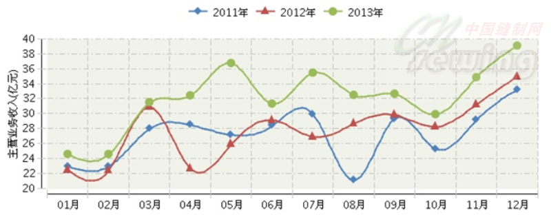 據(jù)國家統(tǒng)計(jì)局統(tǒng)計(jì)數(shù)據(jù)顯示(圖7),2013我國253家規(guī)模以上縫制機(jī)械生產(chǎn)企業(yè)累計(jì)實(shí)現(xiàn)主營業(yè)務(wù)收入386億元,同比增長11.32%,增幅較上年同期增長18個(gè)百分點(diǎn)。其中,二季度行業(yè)規(guī)模以上生產(chǎn)企業(yè)累計(jì)實(shí)現(xiàn)主營業(yè)務(wù)收入101億元,環(huán)比增長24.53%,市場回升勢(shì)頭強(qiáng)烈,三四季度行業(yè)市場延續(xù)良好銷售局面,12月規(guī)模以上企業(yè)月度主營業(yè)務(wù)收入更是高達(dá)39億元,創(chuàng)近年來新高。另據(jù)協(xié)會(huì)統(tǒng)計(jì)數(shù)據(jù)顯示,2013年行業(yè)105家骨干整機(jī)生產(chǎn)企業(yè)累計(jì)實(shí)現(xiàn)主營業(yè)務(wù)收入165億元,同比增長17.91%,增幅較上年同期增長28個(gè)百分點(diǎn);產(chǎn)品總銷量665萬臺(tái),同比增長10.92%,增幅較上年同期增長36個(gè)百分點(diǎn)。