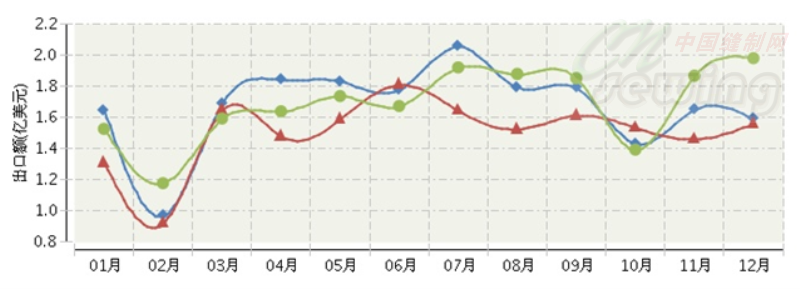 據(jù)海關(guān)總署數(shù)據(jù)顯示(圖9):2013年我國縫制機(jī)械行業(yè)累計(jì)完成出口額22億美元,同比增長9.61%。年初我國縫制機(jī)械產(chǎn)品(不含服裝機(jī)械產(chǎn)品)出口呈現(xiàn)季節(jié)性疲軟,2月出口額降至1.2億美元,自3月份以后出口額逐漸提升至1.6億美元/月左右,至7月升至1.9億美元/月,10月受國慶假期影響出口額降至1.4億美元,至12月再升至2.0億美元,達(dá)到近兩年的最高點(diǎn),全年行業(yè)出口總體相比上年呈平穩(wěn)增長趨勢(shì)。