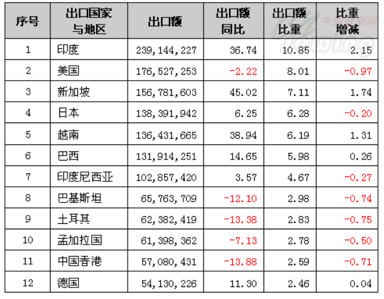 從出口市場來看,2014年我國縫制機(jī)械產(chǎn)品出口印度、巴西、東南亞等地區(qū)出口明顯增長。據(jù)海關(guān)總署數(shù)據(jù)顯示(表5、圖10):2013年我國縫制機(jī)械產(chǎn)品出口印度2.4億美元,同比增長36.74%,高出行業(yè)平均增幅27個(gè)百分點(diǎn),出口額比重達(dá)10.85%,比上年同期增長2.15個(gè)百分點(diǎn),其中僅刺繡機(jī)出口額就達(dá)1.3億美元,同比增長74.07%, 工業(yè)機(jī)出口額0.7億美元,同比增長47.44%。