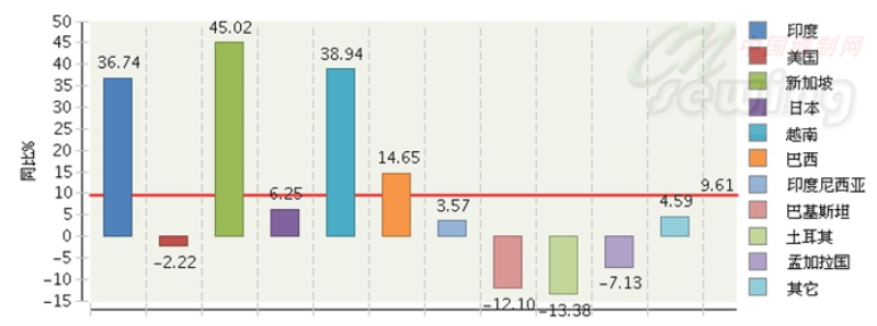圖10 2013年我國縫制機(jī)械產(chǎn)品主要市場出口額同比增長情況