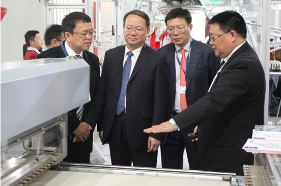 在德國(guó)舉辦的展會(huì)上,上海和鷹機(jī)電科技股份有限公司董事長(zhǎng)尹智勇向中國(guó)紡織工業(yè)聯(lián)合會(huì)副會(huì)長(zhǎng)高勇介紹本公司參展的先進(jìn)設(shè)備