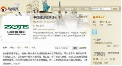 近日,中捷縫紉機(jī)股份有限公司在新浪網(wǎng)上開通了官方微博,并成功通過了新浪官方認(rèn)證,這是縫制行業(yè)里首個開通并獲得認(rèn)證的企業(yè)微博。