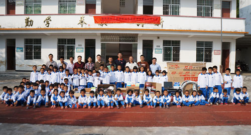 繼27日商會常務(wù)副會長兼秘書長邵力世、副會長蘇國韜、理事謝紹將等商會骨干運(yùn)送教學(xué)物資到清遠(yuǎn)英德花塘小學(xué)后,10月28日,運(yùn)送物資的隊伍馬不停蹄,與常務(wù)理事毛仕棠會合,一起前往清遠(yuǎn)陽山小江中心小學(xué)。到達(dá)小江中心小學(xué)后,商會代表親自把帶來的體育用品、娛教用品及課外讀物等價格一萬多元的教學(xué)物資從貨車上卸下,送到該校師生的手里,也將廣東省縫制設(shè)備商會全體會員的關(guān)心與問候送上。