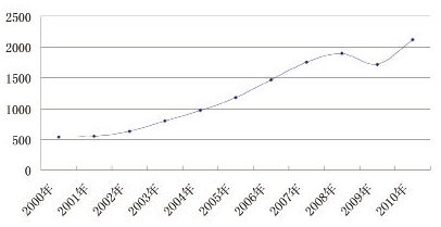 2000年~2010年我國紡織品服裝出口值