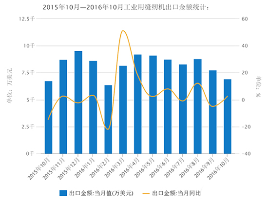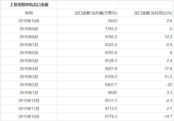 以下為2015年10月—2016年10月工業(yè)用縫紉機出口金額統(tǒng)計: