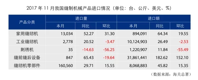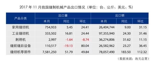 據海關總署統(tǒng)計數據顯示: 2017年11月我國縫制機械行業(yè)出口總額為2.65億美元,同比增長47.69%,環(huán)比增長44.57%,刷新年內出口最高值。各類自動工業(yè)縫紉機及零部件產品出口量值同比增長態(tài)勢明顯;非自動工業(yè)縫紉機、縫紉機針等產品同比略有下滑。具體出口情況如下: