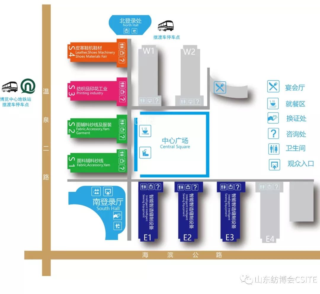 青島國際博覽中心是一個(gè)多區(qū)的展館。要了解QISMA的布局,首先來看看山東紡博會(huì)的分布總圖,主要的設(shè)施在圖上都有標(biāo)識(shí)~