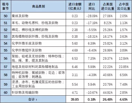 涉及加稅的HS50-60章對(duì)美2017年出口金額如下: