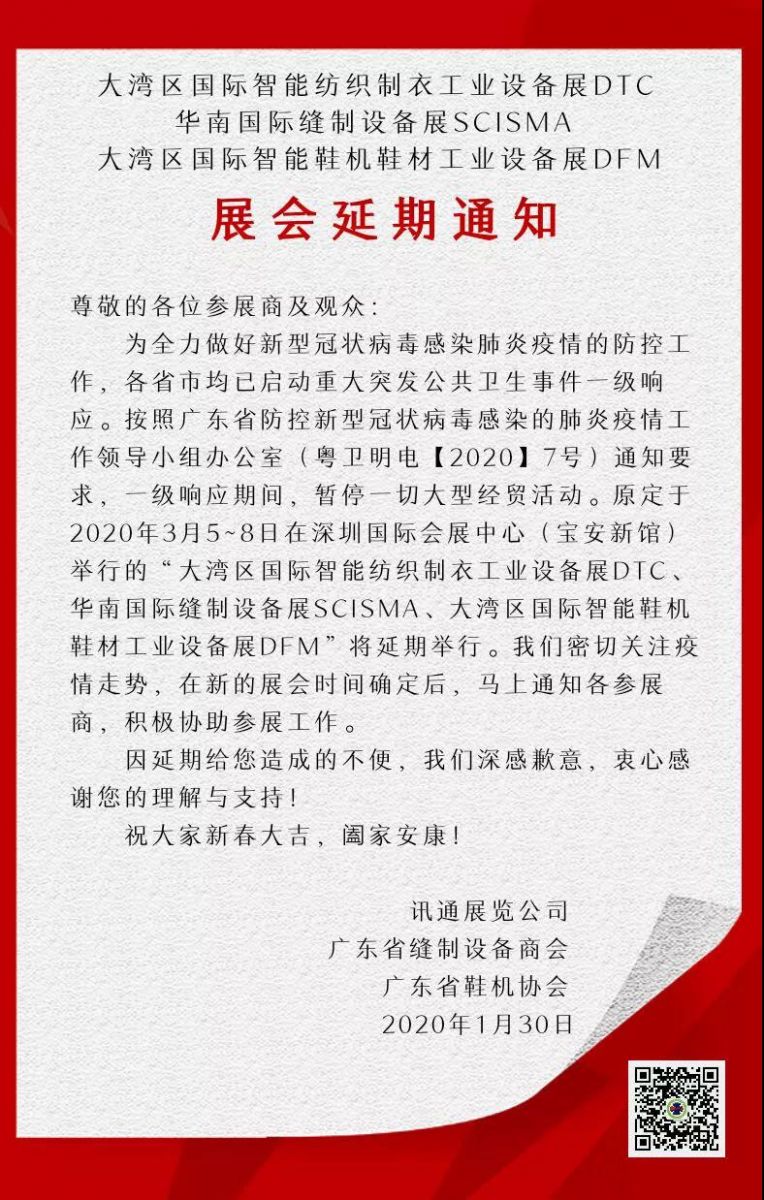 大灣區(qū)暨華南縫制設(shè)備展、鞋機(jī)鞋材展 展會(huì)延期通知