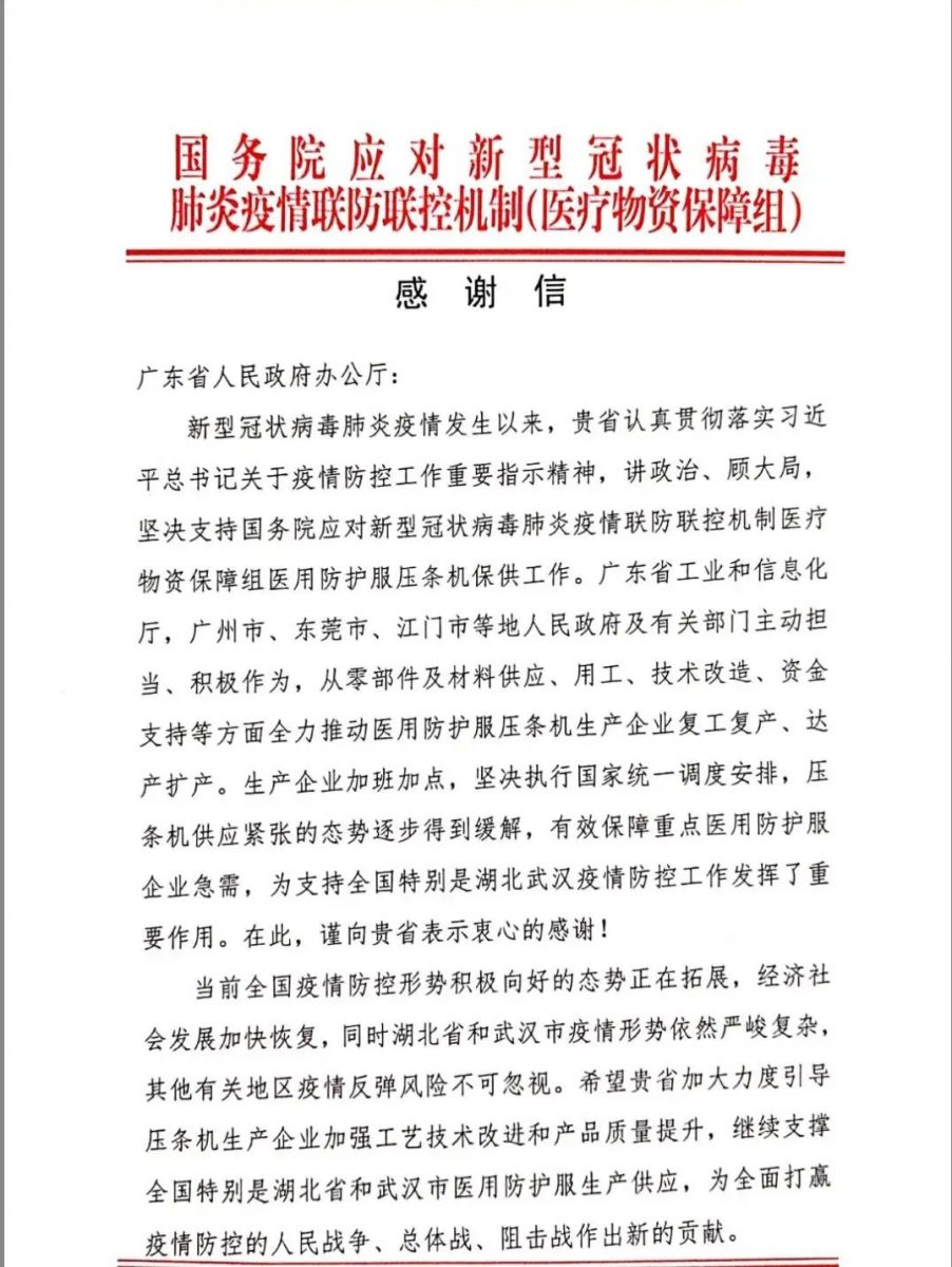 3月1日,國務(wù)院應(yīng)對新型冠狀病毒肺炎疫情聯(lián)防聯(lián)控機(jī)制(醫(yī)療物資保障組)發(fā)出感謝信,對廣東省工信廳,廣州市、東莞市、江門市工信局以及廣州高科制衣設(shè)備有限公司、東莞市邁邦智能制衣設(shè)備有限公司、東莞市昌啟自動化科技有限公司等作出重要貢獻(xiàn)的政府部門和防疫物資生產(chǎn)企業(yè)給予了高度“點(diǎn)贊”。同時(shí),勉勵(lì)政府部門和企業(yè)為全面打贏疫情防控的人民戰(zhàn)爭、總體戰(zhàn)、阻擊戰(zhàn)作出新的貢獻(xiàn)。