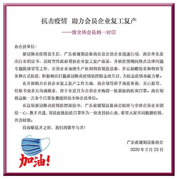 在這場新冠肺炎疫情防控戰(zhàn)役中,廣東省縫制設(shè)備商會始終與全體會員企業(yè)團結(jié)一心、攜手共進,寄送此批抗疫口罩作為一份支持的心意,希望大家共同抵御疫情,共克時艱。