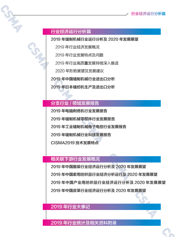 《報(bào)告》匯編了2019年縫制機(jī)械行業(yè)經(jīng)濟(jì)運(yùn)行、進(jìn)出口、零部件、刺繡機(jī)、電子電控、科技發(fā)展以及下游服裝、家紡等行業(yè)發(fā)展十余篇年度專業(yè)分析報(bào)告,從剖析縫制機(jī)械全產(chǎn)業(yè)鏈發(fā)展的高度和視角,為行業(yè)提供了一冊信息量大、分析前瞻、內(nèi)容權(quán)威、數(shù)據(jù)詳實(shí)的年度重要產(chǎn)經(jīng)文獻(xiàn)。希望《報(bào)告》能對讀者深入了解縫制機(jī)械行業(yè)的發(fā)展現(xiàn)狀和趨勢,謀劃科學(xué)發(fā)展提供有益的參考和幫助。