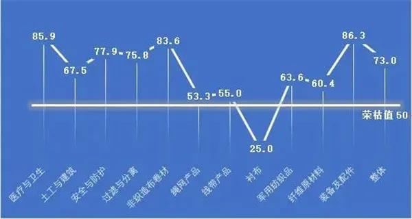 但需要注意的是,上半年行業(yè)的虧損面為18.06%,虧損企業(yè)的虧損額較上年同期增加了7.31%,盡管抗疫物資的生產(chǎn)帶動了行業(yè)整體效益的提升,但處于抗疫物資產(chǎn)業(yè)鏈之外的企業(yè)在經(jīng)營上仍受到較大的影響。協(xié)會的調(diào)研結(jié)果也印證了相關(guān)數(shù)據(jù),上半年行業(yè)的收入指數(shù)為65.6,利潤指數(shù)為61.2。其中,醫(yī)療衛(wèi)生用紡織品及非織造布卷材企業(yè)的收入指數(shù)和利潤指數(shù)分別為72.0和69.5,其他領(lǐng)域企業(yè)的收入指數(shù)和利潤指數(shù)僅為51.2和51.7。從行業(yè)各領(lǐng)域的景氣度來看,醫(yī)療衛(wèi)生、安全防護、過濾與分離、非織造布卷材、裝備及配件領(lǐng)域的景氣度較高,其中從事抗疫物資生產(chǎn)的醫(yī)療衛(wèi)生領(lǐng)域的景氣指數(shù)達到85.9;而繩網(wǎng)、線帶、襯布等領(lǐng)域的景氣指數(shù)相對較低,其中襯布領(lǐng)域的景氣指數(shù)在榮枯值(50)以下。