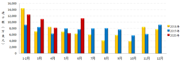 進(jìn)口:據(jù)海關(guān)最新數(shù)據(jù)顯示,2020年1-6月我國(guó)縫制機(jī)械產(chǎn)品累計(jì)進(jìn)口額4.87億美元,同比增長(zhǎng)24.72%,增幅較前5月提升近5個(gè)百分點(diǎn),顯示國(guó)內(nèi)市場(chǎng)正積極穩(wěn)步復(fù)蘇。其中工業(yè)縫紉機(jī)進(jìn)口量1.9萬(wàn)臺(tái),進(jìn)口額3396萬(wàn)美元,同比分別下降18.99%和41.65%。