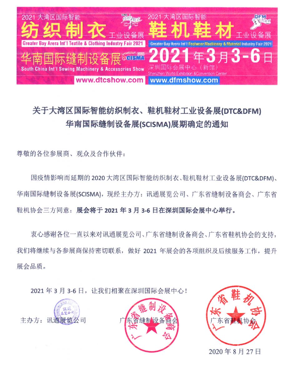 因疫情影響而延期的大灣區(qū)國際智能紡織制衣工業(yè)設(shè)備展DTC、華南國際縫制設(shè)備展SCISMA、鞋機(jī)鞋材工業(yè)設(shè)備展DFM,現(xiàn)經(jīng)主辦方:訊通展覽公司、廣東省縫制設(shè)備商會(huì)、廣東省鞋機(jī)協(xié)會(huì)三方同意:展會(huì)定于2021 年3月3-6日在深圳國際會(huì)展中心舉行。
