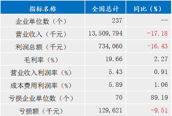 據(jù)統(tǒng)計(jì)局?jǐn)?shù)據(jù)顯示:1-7月,行業(yè)237家規(guī)模以上生產(chǎn)企業(yè)累計(jì)營業(yè)收入135.10億元,同比下降17.18%,降幅較6月收窄0.58個(gè)百分點(diǎn),較一季度收窄9.3個(gè)百分點(diǎn);實(shí)現(xiàn)利潤總額7.34億元,同比下降16.43%,降幅較6月收窄0.91個(gè)百分點(diǎn),較一季度收窄47.8個(gè)百分點(diǎn);毛利率19.66%,同比增長2.27%;營業(yè)收入利潤率5.43%,同比增長0.91%。7月當(dāng)月,規(guī)上企業(yè)營業(yè)收入環(huán)比下降4.07%,利潤總額環(huán)比增長17.26%。