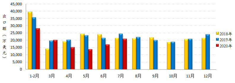 據(jù)海關(guān)總署數(shù)據(jù)顯示:1-7月我國縫制機(jī)械整機(jī)產(chǎn)品累計(jì)出口額11.41億美元,同比下降20.64%,降幅較6月收窄1.3個(gè)百分點(diǎn)。其中,工業(yè)縫紉機(jī)出口量174.86萬臺(tái),出口額5.25億美元,同比分別下降25.23%和27.31%。