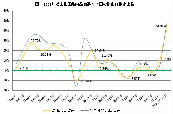 2021年1-3月,紡織服裝累計(jì)出口651億美元,增長(zhǎng)43.8%,其中紡織品出口318.1億美元,增長(zhǎng)40.3%,服裝出口332.9億美元,增長(zhǎng)47.7%。