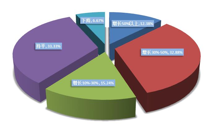 據(jù)統(tǒng)計,受訪企業(yè)中一季度營業(yè)收增長50%的占12.38%,增長30%-50%的企業(yè)占32.88%,增長10-30%的企業(yè)占15.24%,營收持平的企業(yè)占33.33%。
