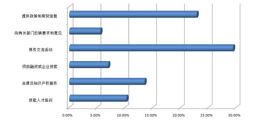 據(jù)本次調(diào)研顯示,受訪會員企業(yè)對商會服務工作的方向主要還是集中在組織商會交流活動、提供政策和商貿(mào)信息、法律及知識產(chǎn)權(quán)服務等方面。