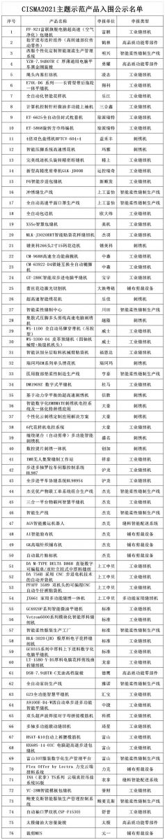 按照《CISMA2021主題示范產(chǎn)品評(píng)選辦法》規(guī)定,經(jīng)協(xié)會(huì)科技委組織專家組嚴(yán)審優(yōu)選,中國縫制機(jī)械協(xié)會(huì)理事長辦公會(huì)議審核,共有54家企業(yè)申報(bào)的76項(xiàng)參展展品成功入圍,入圍名單附后。