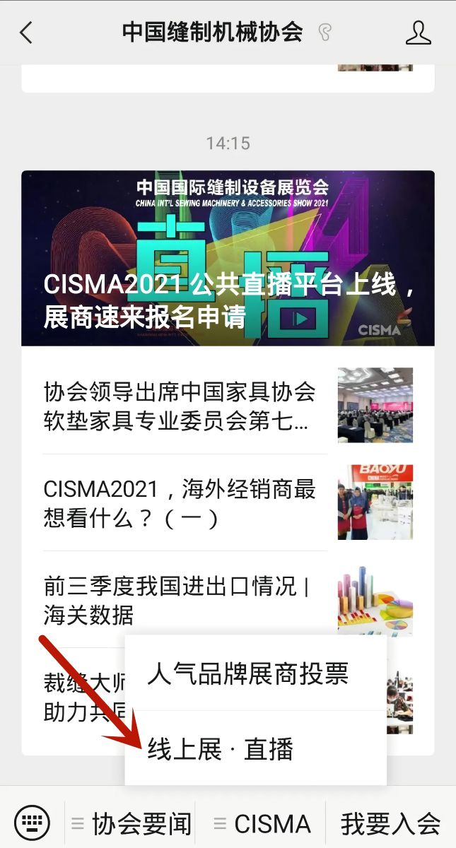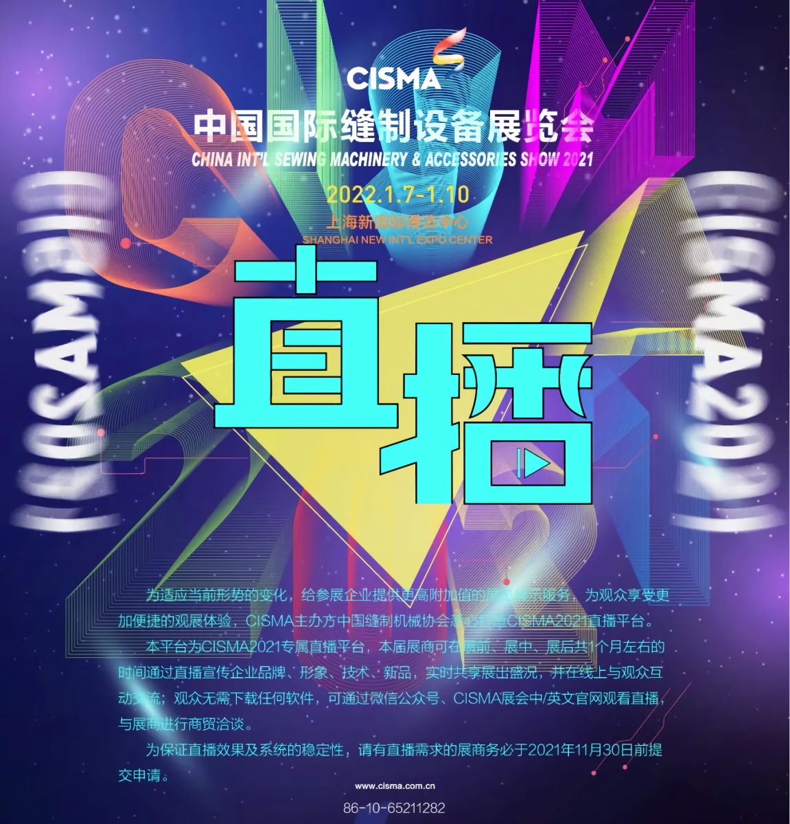 為更加全面地傳遞展品信息、營造展示氛圍、直觀應(yīng)用場(chǎng)景、激發(fā)潛在需求、增強(qiáng)粉絲黏性,給參展企業(yè)提供更高附加值的展覽展示服務(wù),同時(shí)也讓線上線下的觀眾享受到更加便捷的觀展體驗(yàn),由CISMA主辦方中國縫制機(jī)械協(xié)會(huì)悉心打造的CISMA2021公共直播平臺(tái)即將上線。目前,CISMA2021直播平臺(tái)已完成內(nèi)測(cè),有直播需求的展商從即日起,可點(diǎn)擊下方鏈接報(bào)名申請(qǐng)。