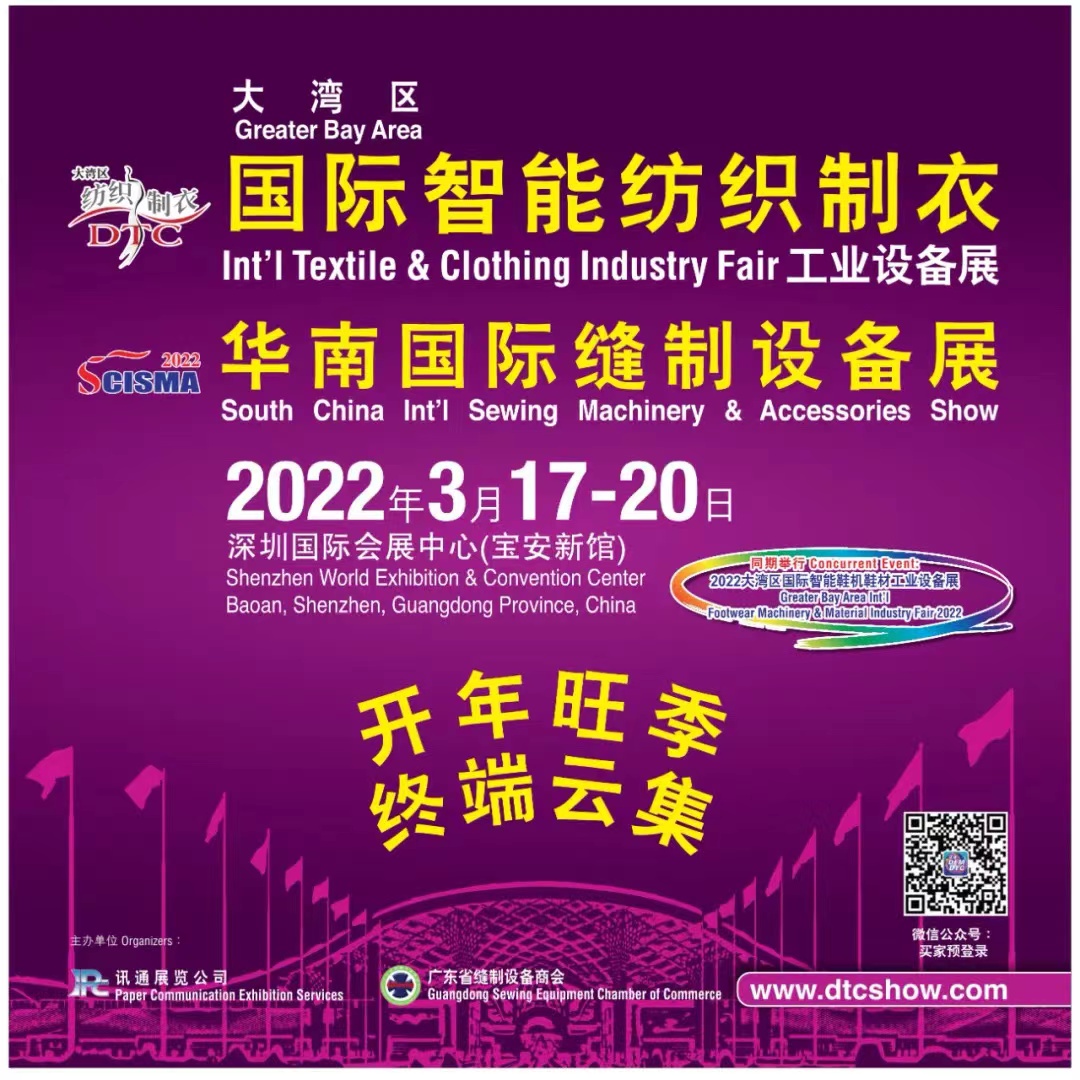 由廣東省縫制設(shè)備商會(huì)、訊通展覽公司聯(lián)合主辦,廣東省鞋機(jī)協(xié)會(huì)協(xié)辦“大灣區(qū)國(guó)際智能紡織制衣工業(yè)設(shè)備展DTC”、“華南國(guó)際縫制設(shè)備展SCISMA”、“大灣區(qū)國(guó)際智能鞋機(jī)鞋材工業(yè)設(shè)備展DFM”將于2022年3月17—20日在深圳國(guó)際會(huì)展中心(寶安新館)17號(hào)館舉行。展出產(chǎn)品包括:縫紉設(shè)備、編織機(jī)械、繡花及激光設(shè)備、印花設(shè)備、超聲波設(shè)備、電腦輔助生產(chǎn)設(shè)計(jì)等智能先進(jìn)設(shè)備及技術(shù),積極配合下游行業(yè)的高端及個(gè)性化生產(chǎn)需求。同時(shí),推動(dòng)響應(yīng)綠色環(huán)保、節(jié)約能源的清節(jié)生產(chǎn)理念。