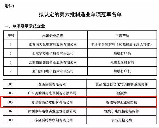 近日,工業(yè)和信息化部發(fā)布《關(guān)于制造業(yè)單項(xiàng)冠軍第六批遴選和第三批通過復(fù)核企業(yè)名單的公示》,中國(guó)縫制機(jī)械行業(yè)再傳捷報(bào):舒普智能技術(shù)股份有限公司入選制造業(yè)單項(xiàng)冠軍擬認(rèn)定名單,琦星智能科技股份有限公司、浙江越隆縫制設(shè)備有限公司擬通過第三批復(fù)核。
