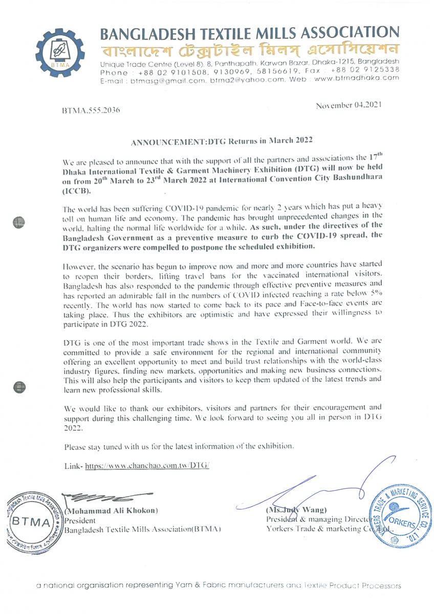原定于2022 年1 月在孟加拉首都達(dá)卡舉辦的“孟加拉國際紡織暨制衣機(jī)械展DTG”將延期至2022 年3 月20-23 日舉行,具體信息請參考下文通知: