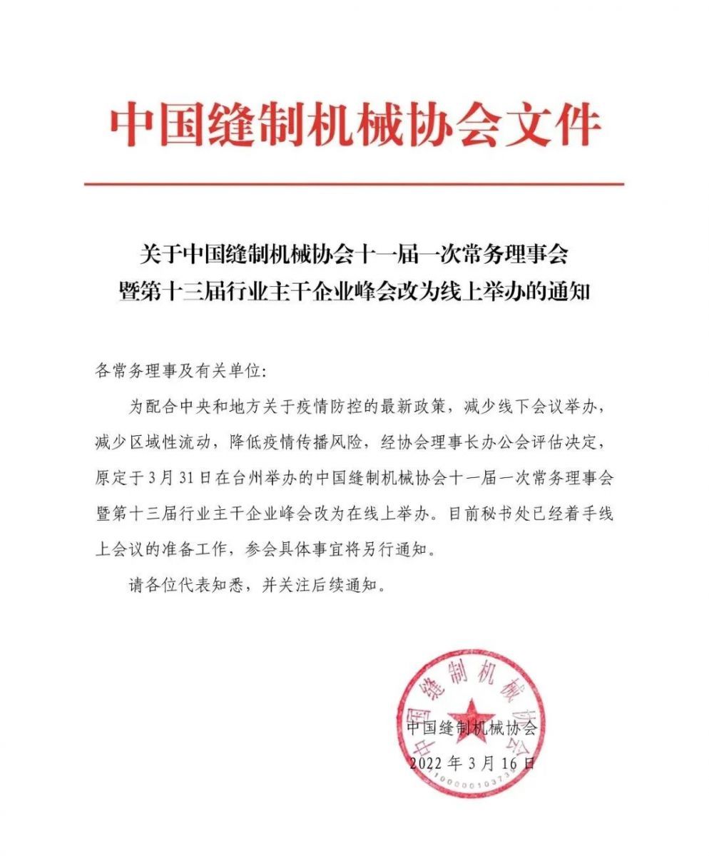為配合中央和地方關(guān)于疫情防控的最新政策,減少線下會(huì)議舉辦,減少區(qū)域性流動(dòng),降低疫情傳播風(fēng)險(xiǎn),經(jīng)協(xié)會(huì)理事長(zhǎng)辦公會(huì)評(píng)估決定,原定于3 月31日在臺(tái)州舉辦的中國(guó)縫制機(jī)械協(xié)會(huì)十一屆一次常務(wù)理事會(huì)暨第十三屆行業(yè)主干企業(yè)峰會(huì)改為在線上舉辦。目前秘書(shū)處已經(jīng)著手線上會(huì)議的準(zhǔn)備工作,參會(huì)具體事宜將另行通知。請(qǐng)各位代表知悉,并關(guān)注后續(xù)通知。