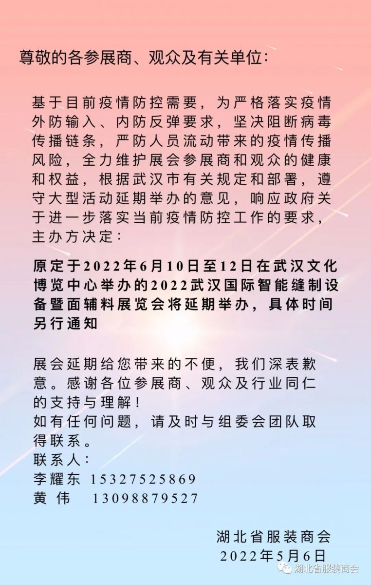 關(guān)于2022武漢國際智能縫制設備暨面輔料展延期舉辦的通知