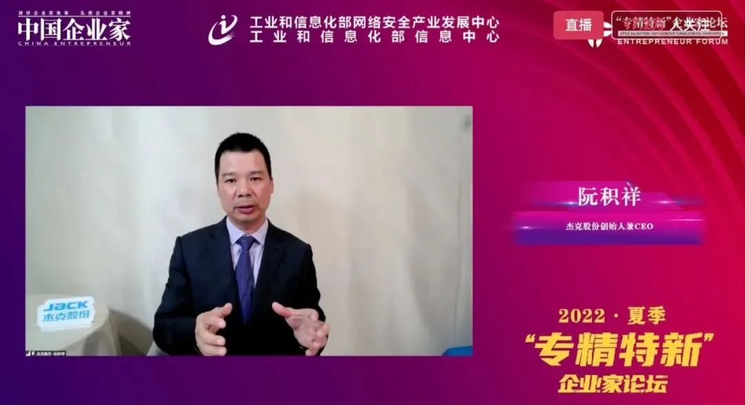 日前,由工業(yè)和信息化部網(wǎng)絡(luò)安全產(chǎn)業(yè)發(fā)展中心和《中國(guó)企業(yè)家》雜志社聯(lián)合主辦的“專精特新”企業(yè)家論壇線上啟動(dòng)。杰克股份創(chuàng)始人阮積祥出席論壇并作經(jīng)驗(yàn)分享。