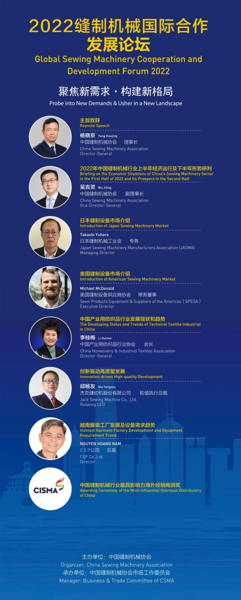 為充分發(fā)揮CISMA展會平臺作用,暢享各國縫制機械行業(yè)市場發(fā)展情況,加快推進國際交流合作,7月30日下午,由主辦方中國縫制機械協(xié)會舉辦的CISMA主題活動——2022縫制機械國際合作發(fā)展論壇將在寧波國際會展中心8號館公共論壇區(qū)隆重舉辦。