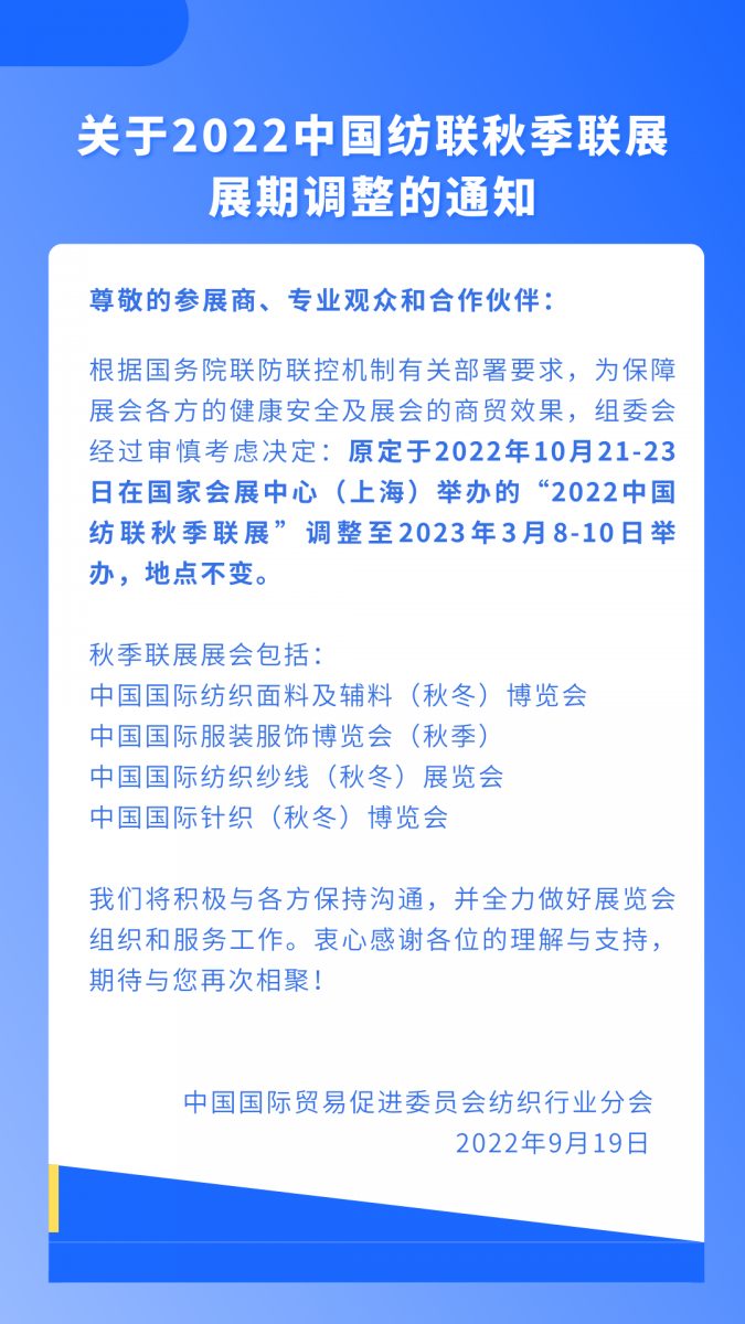 > 2022中國紡聯(lián)秋季聯(lián)展展期調(diào)整