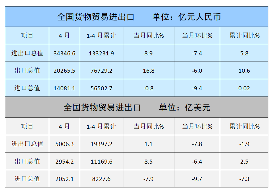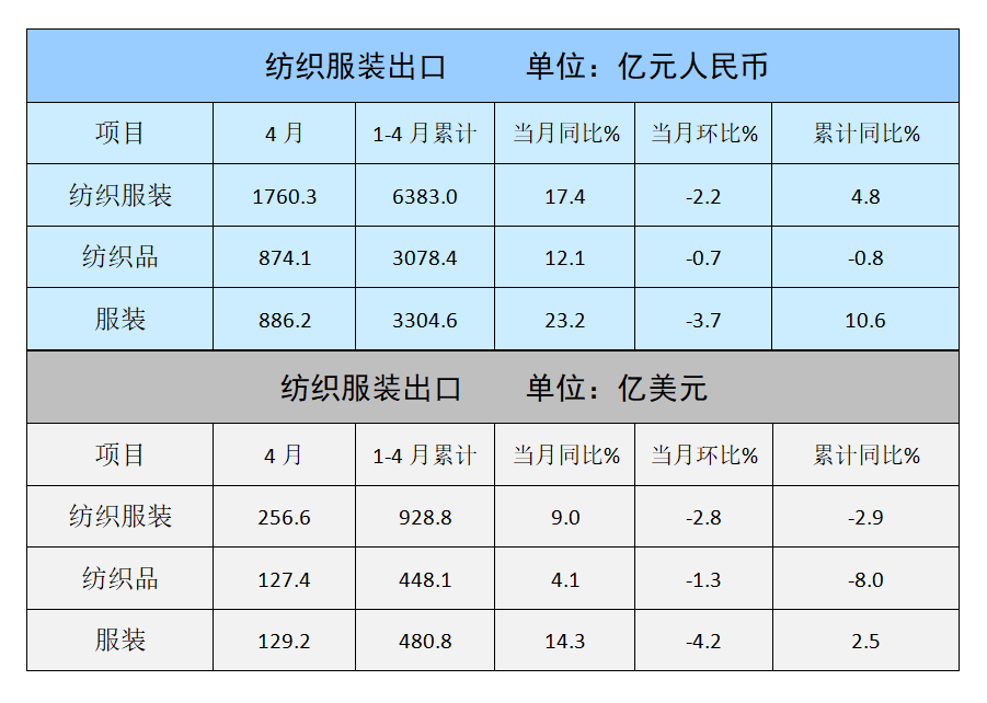 4月,紡織服裝出口256.6億美元,增長(zhǎng)9%,環(huán)比下降2.8%,其中紡織品出口127.4億美元,增長(zhǎng)4.1%,環(huán)比下降1.3%,服裝出口129.2億美元,增長(zhǎng)14.3%,環(huán)比下降4.2%。
