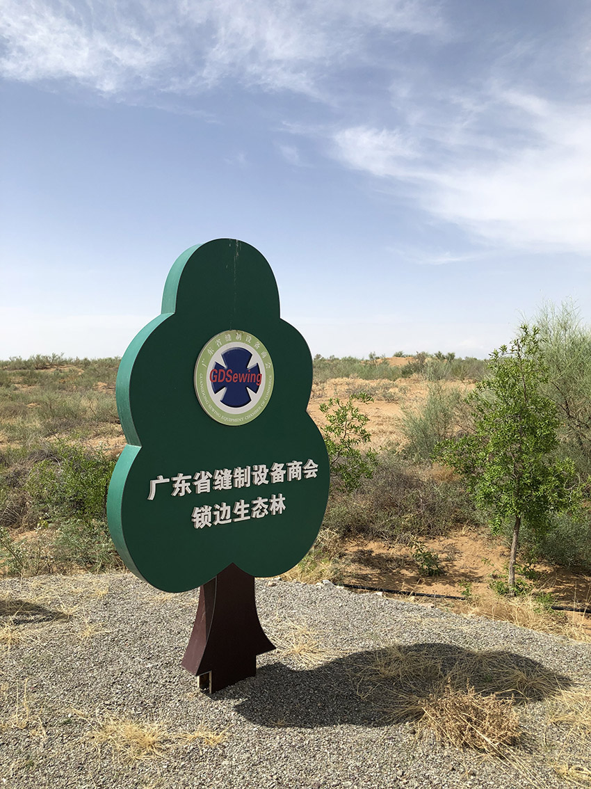 2017 年 9 月,商會聯(lián)合阿拉善鎖邊生態(tài)協(xié)力中心在內(nèi)蒙古阿拉善騰格里沙漠鎖邊生態(tài)公益基地捐建了“廣東省縫制設(shè)備商會沙漠鎖邊生態(tài)林”,至今,已有 83 家企業(yè)及個(gè)人參與捐建,商會及 17 位企業(yè)家和工作人員認(rèn)種了鎖邊生態(tài)林,合計(jì) 124 畝;商會會員企業(yè)先后有 100 多人次參與到此項(xiàng)“種樹植心”的公益活動中,取得了良好的生態(tài)效益和社會效益。