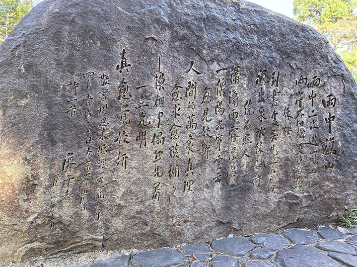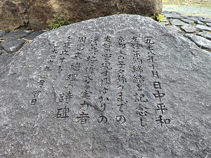 為緬懷周恩來(lái)總理、紀(jì)念中日和平友好條約的締結(jié),周恩來(lái)《雨中嵐山》詩(shī)碑于1979年4月在京都嵐山地區(qū)的龜山公園落成。1978年《中日和平友好條約》締結(jié)后,鄧小平和中日友好協(xié)會(huì)會(huì)長(zhǎng)廖承志訪日時(shí),由日本國(guó)際貿(mào)易促進(jìn)會(huì)等中日友好團(tuán)體提議,中日雙方共同建造的。碑身使用京都名石鞍馬石,上面鐫刻的《雨中嵐山》,由廖承志手書。背面刻著為建碑作出貢獻(xiàn)的團(tuán)體和代表的名字。1979年4月16日,鄧穎超同志借訪問(wèn)日本之際親赴京都,為詩(shī)碑落成揭幕。