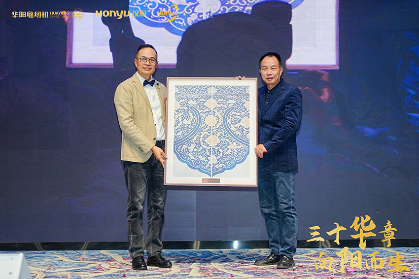 華陽公司作為商會常務副會長單位,一直以來都積極關注和大力支持商會的各項活動,與商會成員們攜手共進,為商會和行業(yè)的整體健康發(fā)展做出重要貢獻。在華陽公司成立三十周年的這一重要時刻,商會向華陽致以最真摯的祝福,祝愿華陽公司在未來的發(fā)展道路上,能夠繼續(xù)秉持優(yōu)良傳統(tǒng),不斷開拓創(chuàng)新,續(xù)寫更加輝煌的新篇章。陳耀南會長代表商會向華陽公司贈送紀念品——《青出于藍》。這幅作品寓意著創(chuàng)新與發(fā)展,象征著超越與進步,寄托了商會對華陽公司在未來能夠不斷突破自我、超越過往,在縫紉機行業(yè)中持續(xù)引領潮流、綻放更加耀眼光芒的殷切期望。