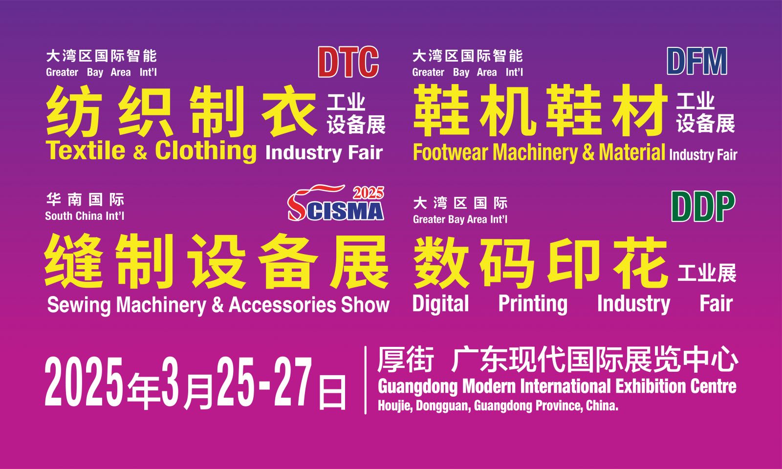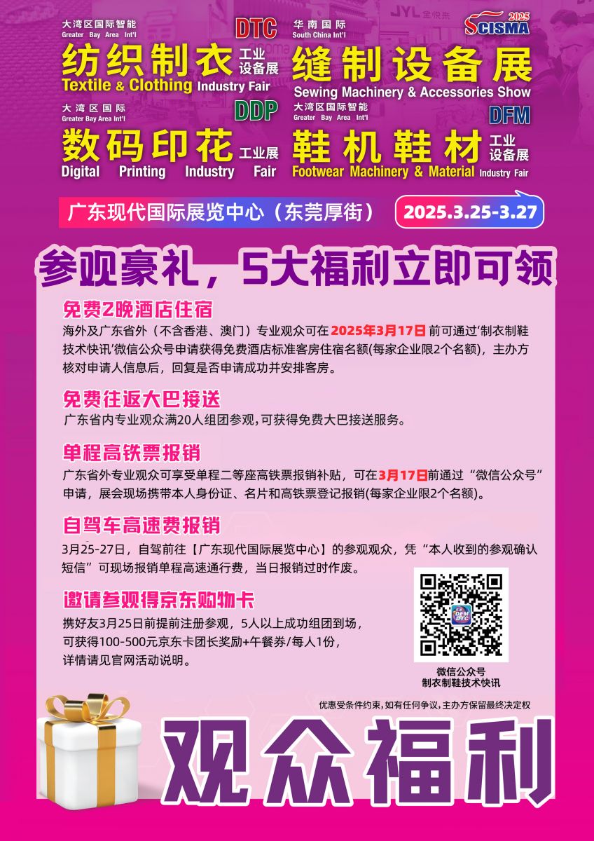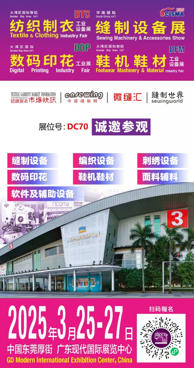2025大灣區(qū)國際智能紡織制衣工業(yè)設(shè)備展、華南國際縫制設(shè)備展、國際智能鞋機(jī)鞋材工業(yè)設(shè)備展、國際數(shù)碼印花工業(yè)展,不僅是一場匯聚前沿科技與創(chuàng)新解決方案的盛會,更是展商們展示實(shí)力、拓展市場的優(yōu)選平臺。我們誠摯地祝愿每一位參展商能夠借此契機(jī),充分展示各自領(lǐng)域的最新成果與卓越技術(shù),吸引來自全球的目光與合作意向,收獲滿滿的商機(jī)與合作伙伴。愿此次展會成為推動產(chǎn)業(yè)升級、促進(jìn)商貿(mào)交流的重要橋梁,為參展商開啟無限可能的新篇章。期待2025年3月25-27日,我們東莞厚街現(xiàn)代展館見!