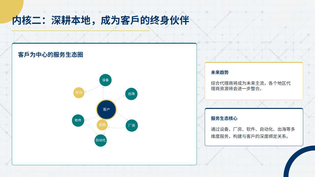 針對(duì)北方地區(qū)分銷商多為夫妻店、缺乏專業(yè)售前能力的現(xiàn)狀,組建專業(yè)售前團(tuán)隊(duì)提供支持;提前洞察市場(chǎng)趨勢(shì),引入前沿自動(dòng)化產(chǎn)品,與分銷商共同培育市場(chǎng)、教育客戶;構(gòu)建完善的售后支撐體系,解決分銷商的售后顧慮,形成“總代賦能 + 分銷推廣”的良性循環(huán)。