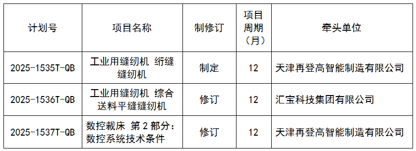 近日,工業(yè)和信息化部辦公廳正式印發(fā)《2025年第五批行業(yè)標(biāo)準(zhǔn)制修訂和外文版項(xiàng)目計(jì)劃的通知》(工信廳科函〔2025〕528號(hào)),由全國(guó)縫制機(jī)械標(biāo)準(zhǔn)化技術(shù)委員會(huì)報(bào)送的《工業(yè)用縫紉機(jī) 絎縫縫紉機(jī)》等3項(xiàng)行業(yè)標(biāo)準(zhǔn)正式批準(zhǔn)立項(xiàng),具體項(xiàng)目信息如下: