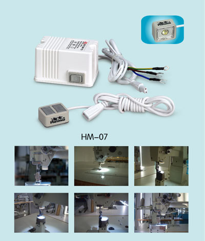 型號: HM-07 1.LED: 1W 2.輸入電壓: 交流220V(380V), 50Hz 3.輸出電壓: 直流3.5V, 160mA 4.接線端: 電機開關 特點: 1.省電 2.不發(fā)熱 3.輕巧 4.壽命長 5.光線柔和 6.光線可分兩級調光 7.適用于任何縫紉機