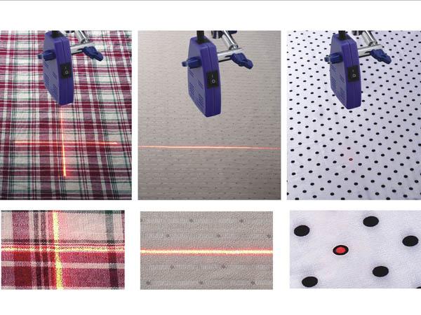 針對有特殊花樣格式之布料,在迭布時經(jīng)由雷射記號標(biāo)線器的照射,使得每一層不管是圓點(diǎn)、格 子或直線都能很準(zhǔn)確地裁切在同一位置上。