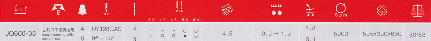 Edge trimmer with left edge and auto-pneumatic device,which can deburr and guarantees powerful stitching and prefect seaming.Applicable to cylinder fabric crease that medium-thick costuming such as T-Shirts,round-neck shirts,etc.