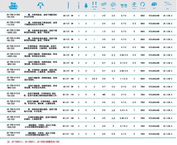 JK-798超高速包縫機(jī)系列廣泛適用于服裝、內(nèi)衣、床上用品及薄形包裝和皮革制品等各種面料的搭接縫、裝飾縫,另外還有多種線跡可供選擇。其通過簡單的張力調(diào)節(jié)便可縫出完美的線跡。送料機(jī)構(gòu)的改良,而零件的耐磨設(shè)計(jì)延長了機(jī)器的使用時(shí)間。同時(shí),對差動比、針桿行程量的調(diào)節(jié)方式的改進(jìn)大大提高了操作的便捷性。