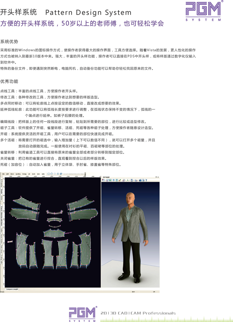 PGM樣版設(shè)計(jì)軟件能夠簡(jiǎn)單快捷的輸入現(xiàn)在已有的紙樣。最復(fù)雜樣版的所有細(xì)節(jié)都可以毫無(wú)遺漏的保存。只需要很少的幾個(gè)點(diǎn)就可以保證同原始樣版曲線的吻合。任何樣版都可以在幾秒鐘之內(nèi)完成描圖。